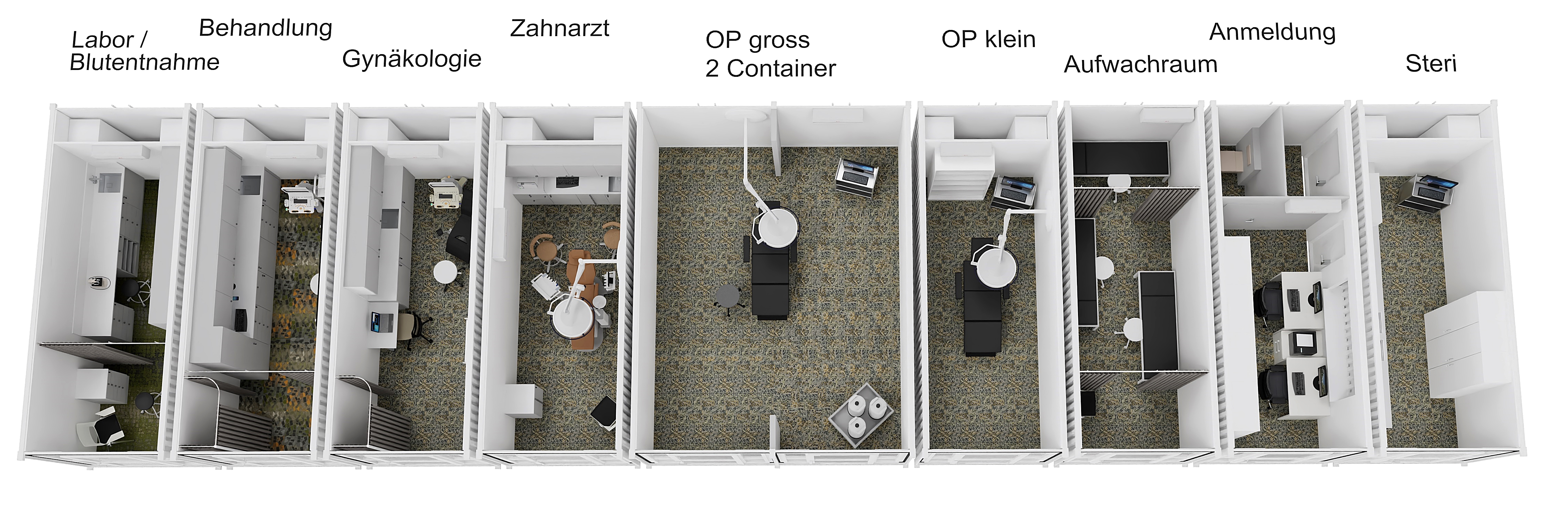 Die Container können in unterschiedlichen Einheiten gebaut und flexibel zusammengesetzt werden, um spezifische medizinische Bedürfnisse zu erfüllen